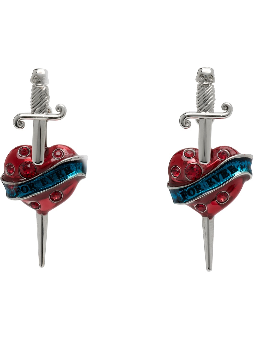 Pair of drop earrings in silver-tone brass. · Engraved text and crystals at face · Enameled graphic in red and blue at drop · Post-stud fastening · H1.75" x W0.75" Part of the Tres Gaultier collection. Supplier color: Silver Brass. Made in Italy 252808M144005