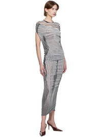 Sheer nylon tulle maxi dress. Gathering and striped trompe-l'oeil pattern throughout. · Layered and draped construction · Crewneck · Locker loop at back collar · Open back · Ruching at back Supplier color: White/Black 100% polyamide. Made in Italy 251808F055009