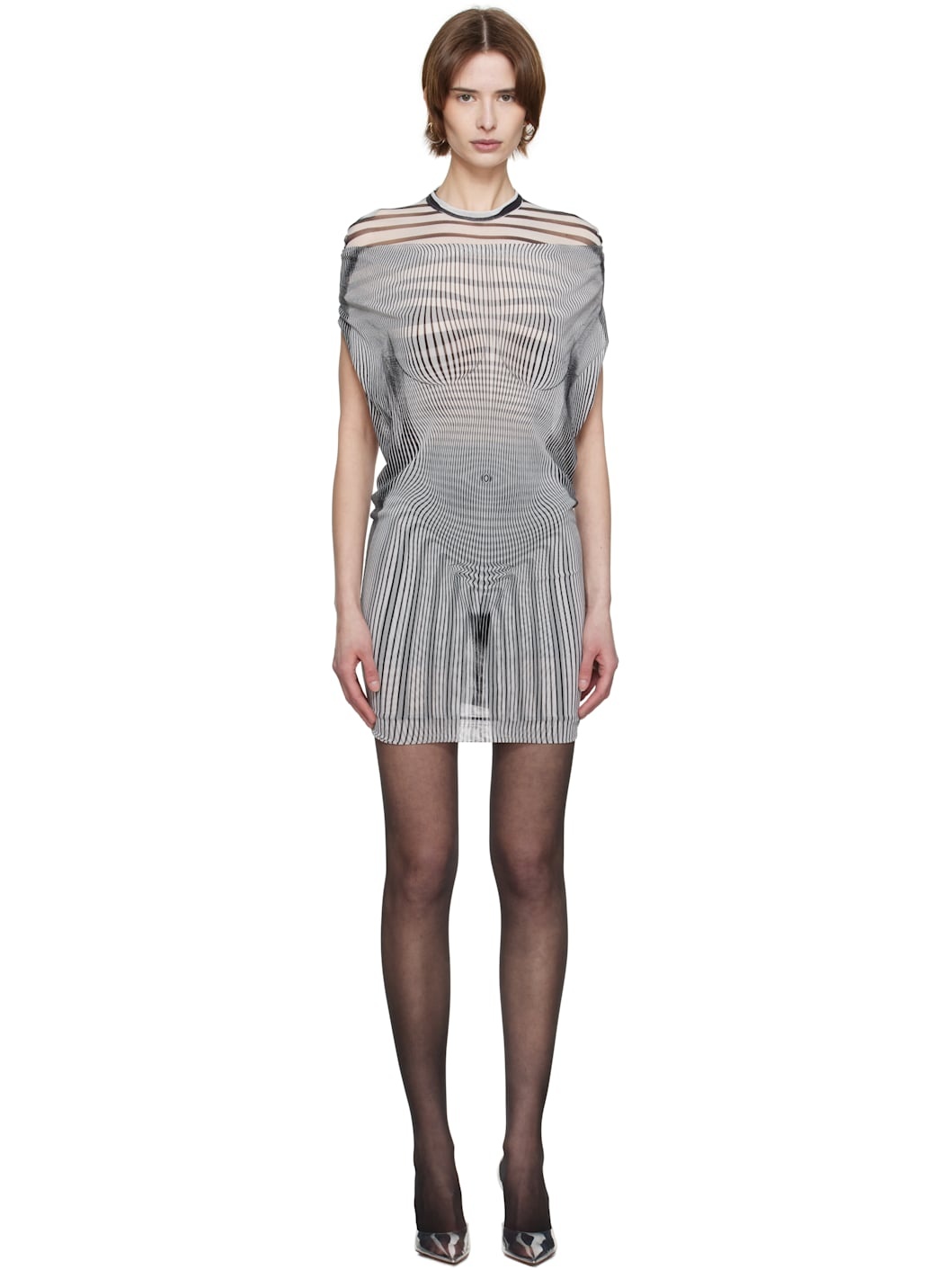 Sheer nylon tulle minidress. Gathering and striped trompe-l'oeil pattern throughout. · Layered and draped construction · Crewneck · Locker loop at back · Open back · Ruching at back Supplier color: White/Black 100% polyamide. Made in Italy 251808F052010
