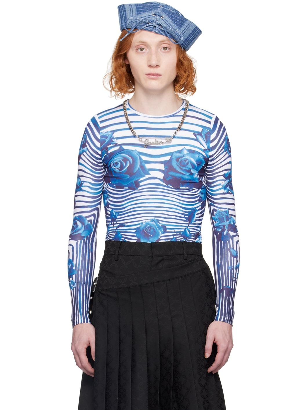 Stretch jersey T-shirt. Stripes and floral pattern printed throughout. · Crewneck · Locker loop at back collar Supplier color: White/Navy/Aqua 87% polyester, 13% elastane. Made in Portugal 242808M213006