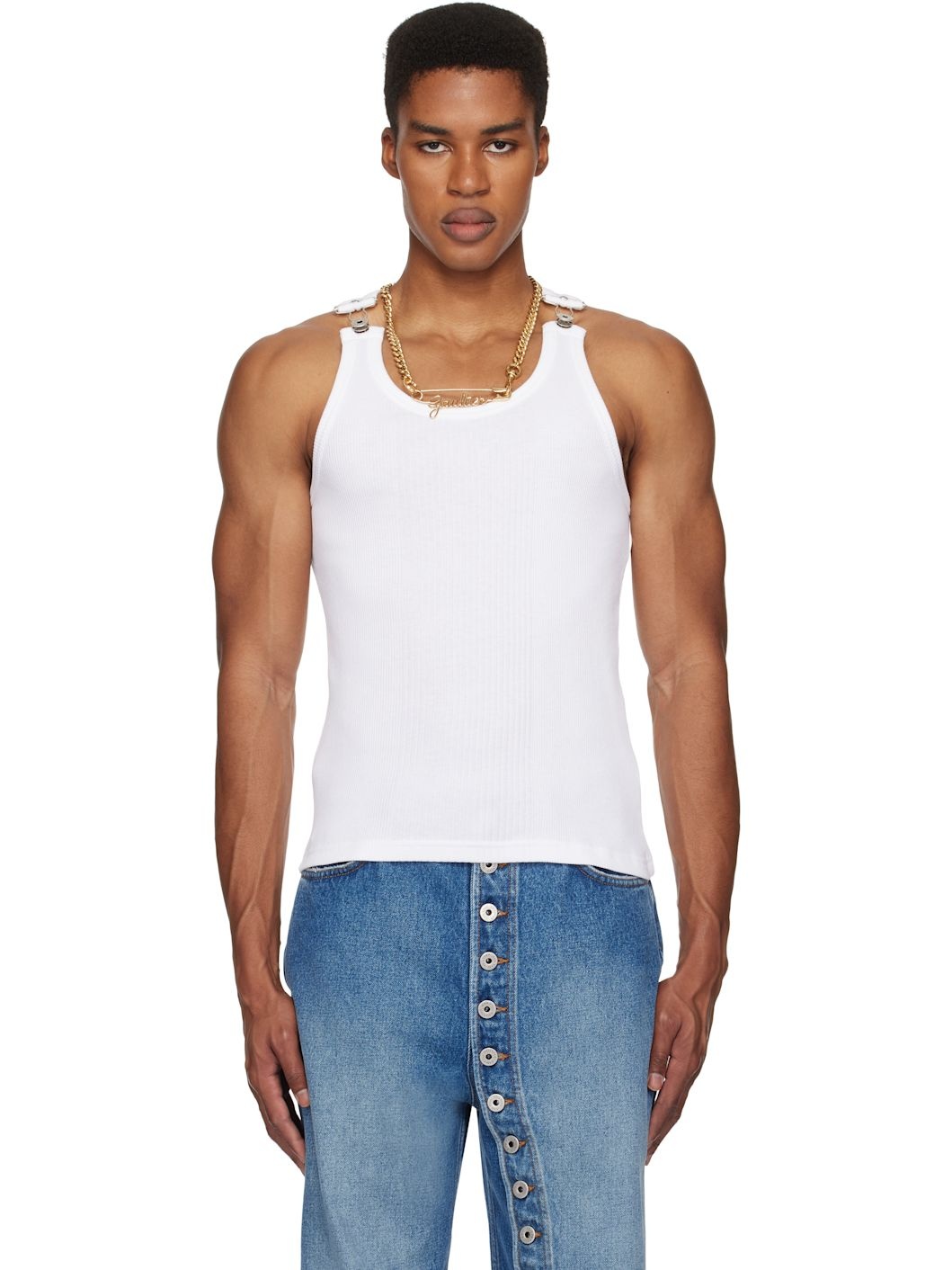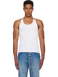 Cotton ribbed jersey tank top. · Scoop neck · Overall fastening at shoulder straps · Locker loop at back collar · Logo-engraved silver-tone hardware Part of the Tres Gaultier collection. Supplier color: White 100% cotton. Made in Bulgaria 251808M214000