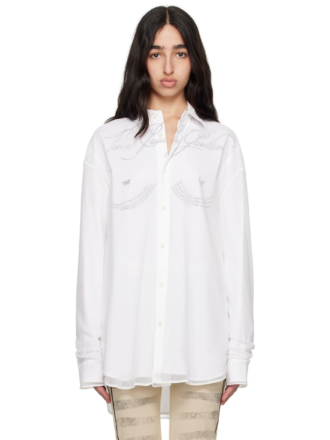 Cotton poplin shirt. Sheer nylon tulle overlay. · Layered construction · Spread collar · Button closure · Logo graphic and text printed at front · Shirttail hem · Dropped shoulders · Buttoned barrel cuffs · Locker loop at back collar · Graphic printed at back · Mother-of-pearl hardware Supplier color: Black/White Body 1: 100% cotton. Body 2: 100% polyamide. Made in Portugal 251808F109009