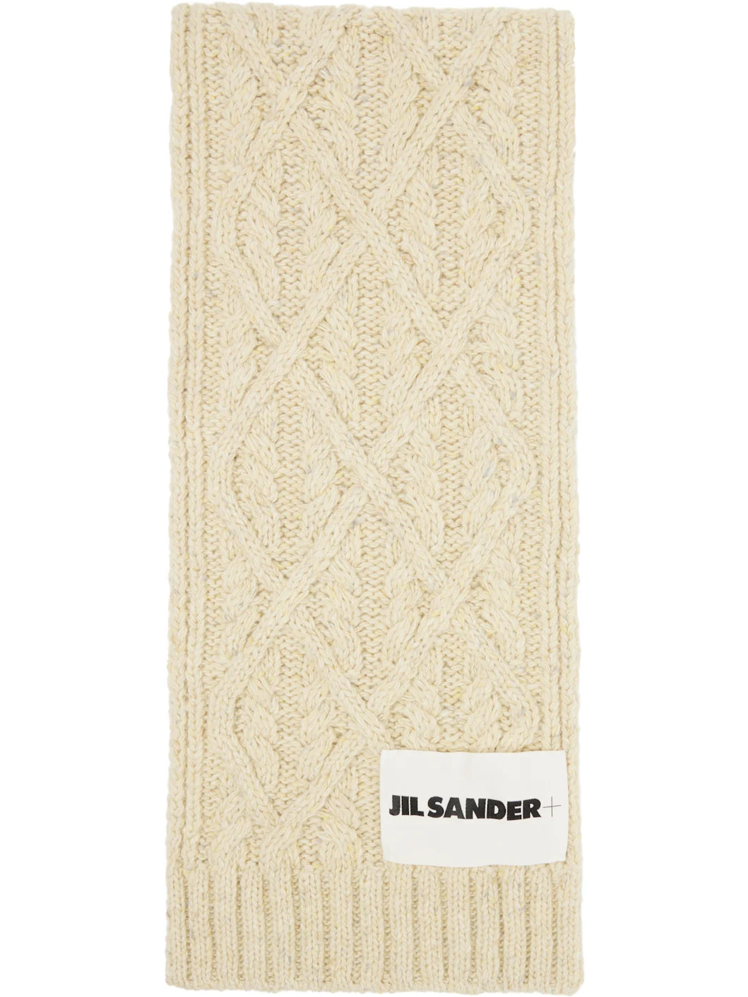 Rectangular cable-knit virgin wool scarf. · Logo patch at face · Rib-knit ends · L66" x W9.75" Supplier color: Natural 100% virgin wool. Made in Italy 252249F028006