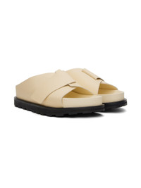 Buffed calfskin slip-on sandals in beige. · Open toe · Velcro strap at vamp · Logo patch at molded leather footbed · Grained leather lining · Foam rubber midsole · Treaded rubber sole Supplier color: Champagne Upper: calfskin. Sole: rubber. Made in Italy 241249F121001