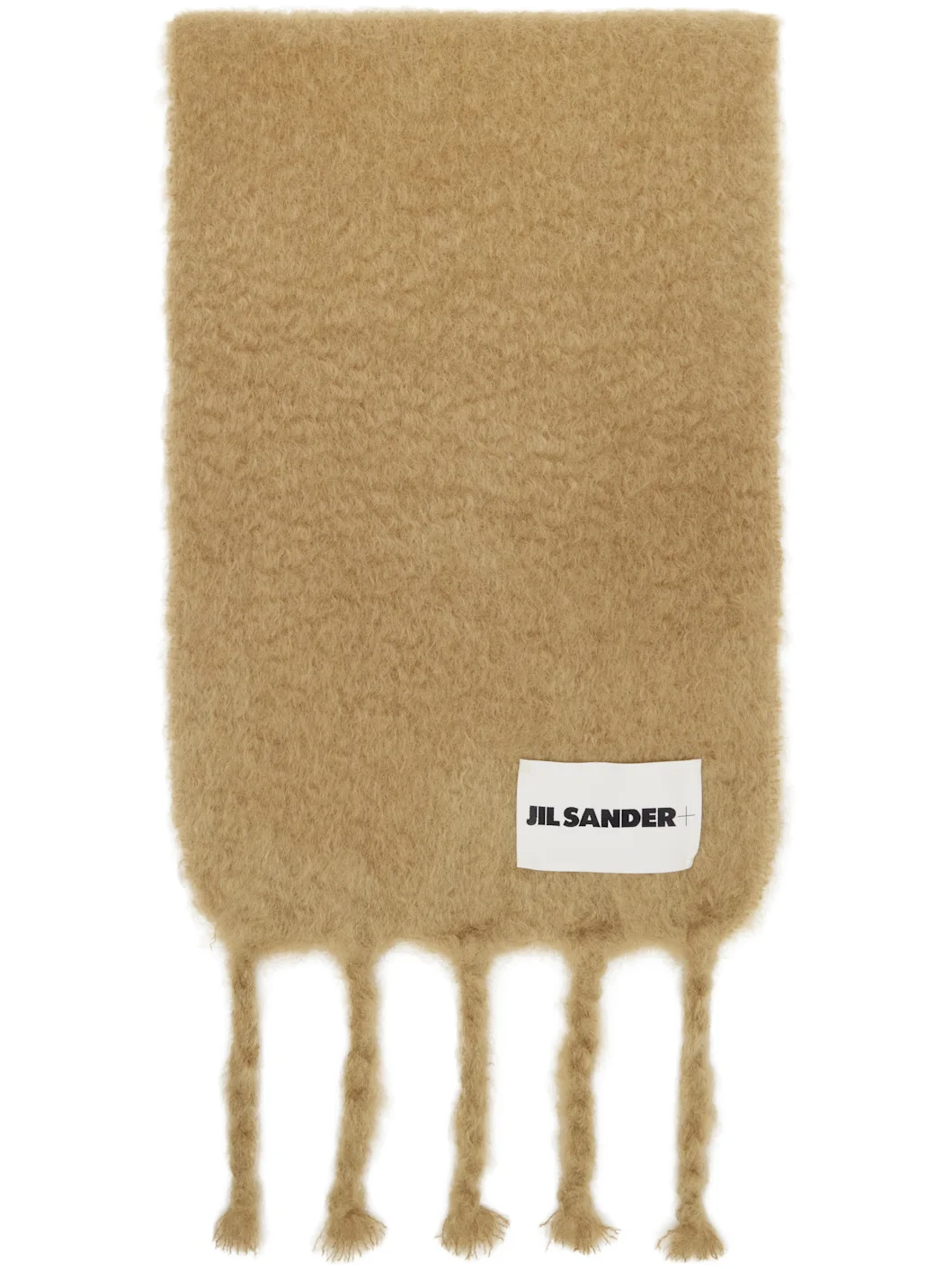 Rectangular hand-knit mohair- and wool-blend scarf. · Logo patch at face · Fringed detailing at ends · L86" x W16.5" Supplier color: Beige 73% mohair, 24% wool, 3% polyamide. Made in Spain 252249F028009