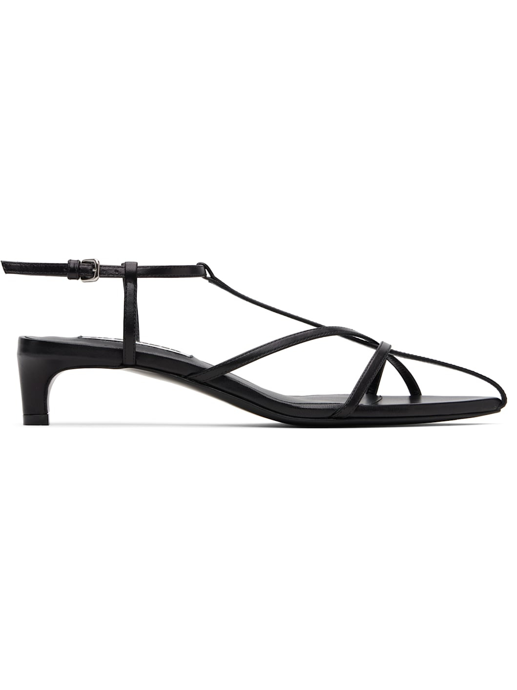 Buffed goatskin heeled sandals. · Pointed open toe · Pin-buckle ankle strap · Covered kitten heel · Leather sole with rubber injections · Heel: H1.5" Supplier color: Black Upper: goatskin. Sole: leather, rubber. Made in Italy 252249F125001
