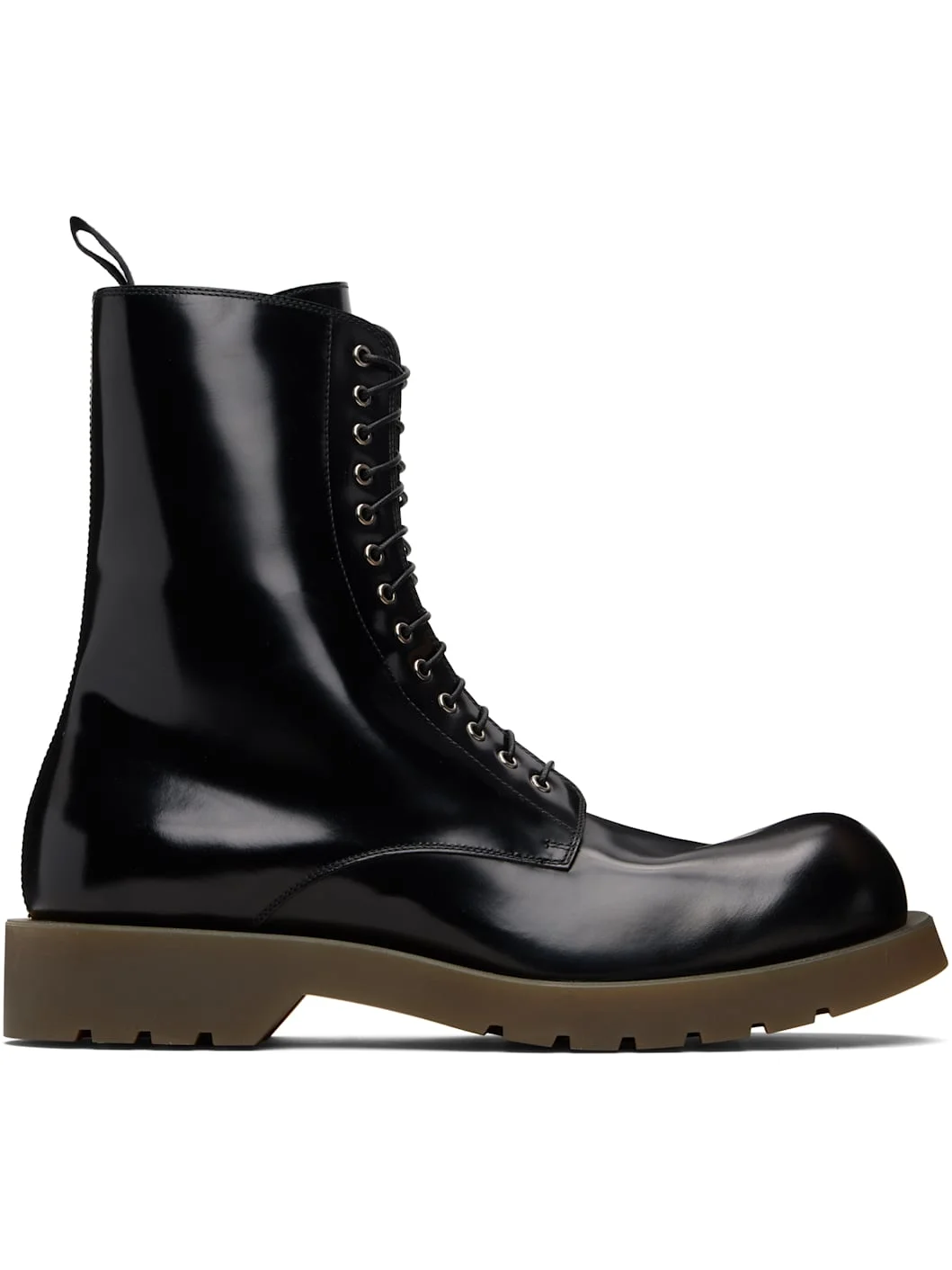 Ankle-high polished leather boots. · Lace-up closure · Pull-loop at collar · Grained leather lining · Treaded rubber sole Supplier color: Black Upper: leather. Sole: rubber. Made in Italy 252249M222001