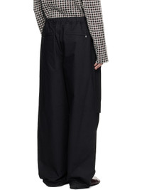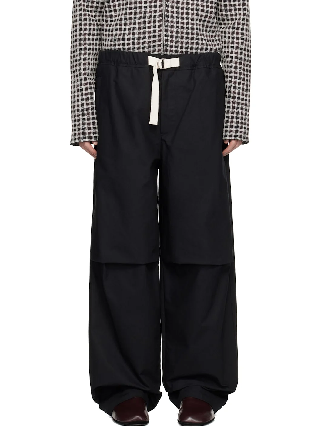 Peached organic cotton poplin trousers. · Water-repellent · Loose-fit · Integrated cinch belt at partially elasticized waistband · Four-pocket styling · Zip fly · Pleat at knees · Concealed drawstring at cuffs · Logo embroidered at back Supplier color: Black 100% cotton. Made in Italy 252249M191008