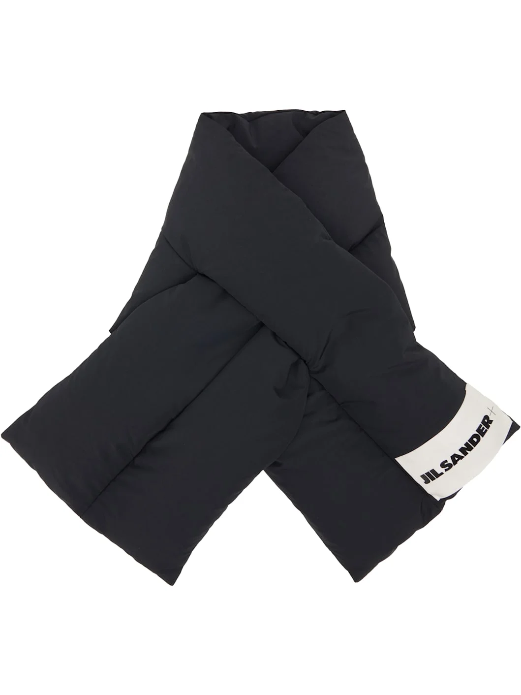 Down-filled and quilted recycled polyester taffeta scarf. · Water-repellent · Pull-through slot and logo patch at face · Taffeta lining · L44.5" x W8.5" Supplier color: Black Body: 100% polyester. Fill: 85% goose down, 15% goose feather. Lining: 100% polyester. Made in Italy 252249F028013