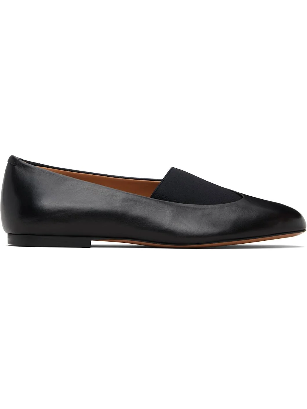 Buffed calfskin ballerina flats. · Elasticized panel at vamp · Buffed calfskin lining · Stacked heel with rubber injection · Calfskin sole Supplier color: Black Calfskin. Made in Italy 261249F118005