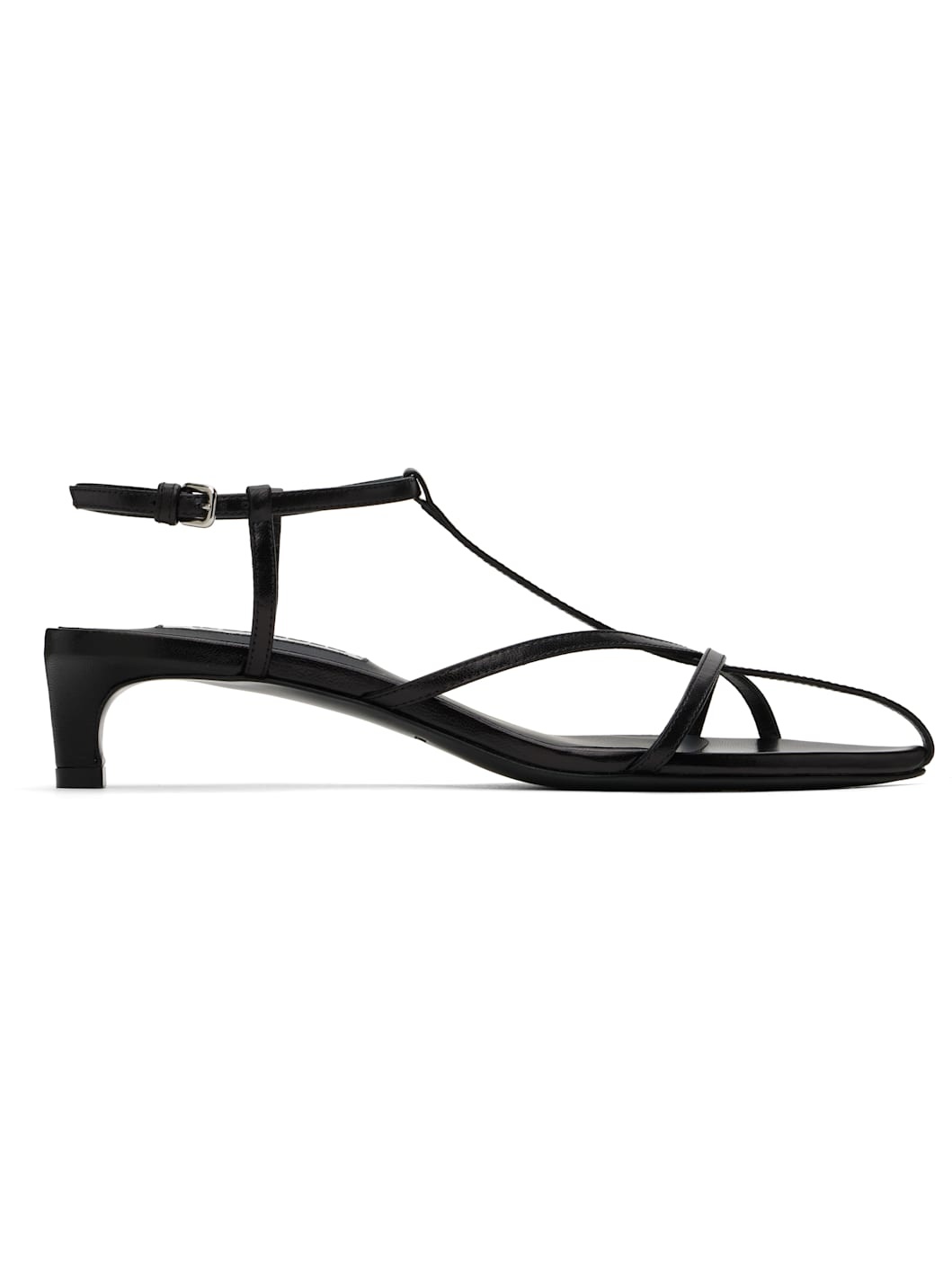 Buffed goatskin heeled sandals in black. · Open pointed toe · Crisscrossing straps at vamp · Adjustable pin-buckle ankle strap · Logo patch at padded footbed · Covered kitten heel with rubber injection · Leather sole with rubber injection · Heel: H1.5" Supplier color: Black Upper: goatskin. Sole: leather, rubber. Made in Italy 251249F125002
