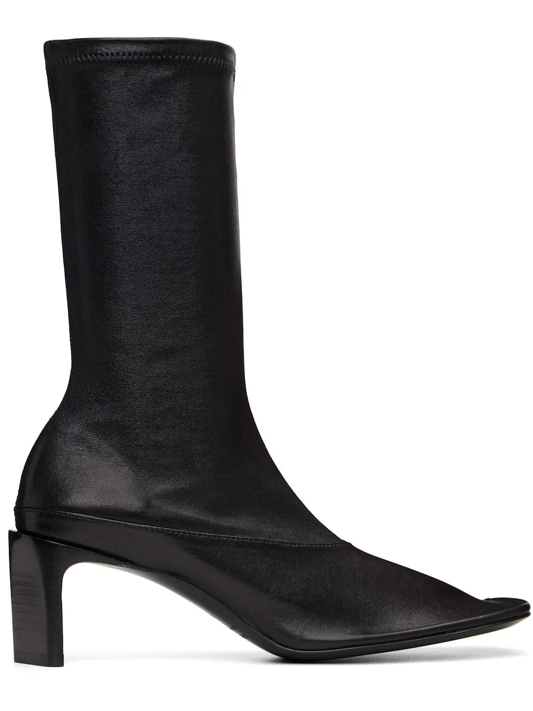 Mid-calf grained sheepskin boots. · Square toe · Elasticized collar · Canvas lining · Stacked leather heel with rubber injection · Leather sole with rubber injection · Heel: H2.5" Supplier color: Black Upper: sheepskin. Sole: leather, rubber. Made in Italy 252249F114000