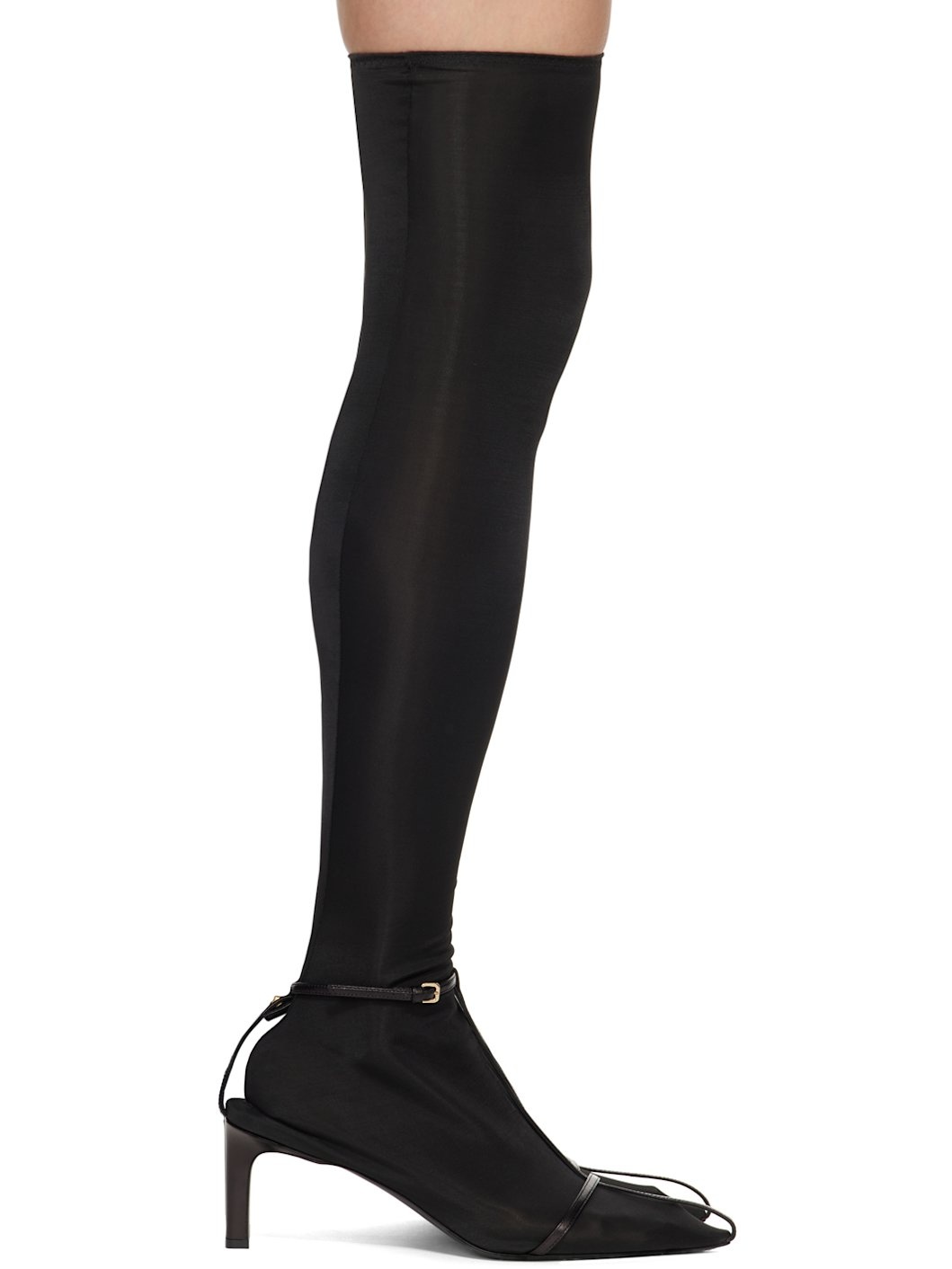 Knee-high semi-sheer stretch nylon jersey sock-style boots in black. · Buffed goatskin straps throughout · Pointed toe · Pin-buckle ankle strap · Covered stiletto heel with rubber injection · Leather sole · Heel: H3" Supplier color: Black Textile, goatskin. Made in Italy 241249F122006
