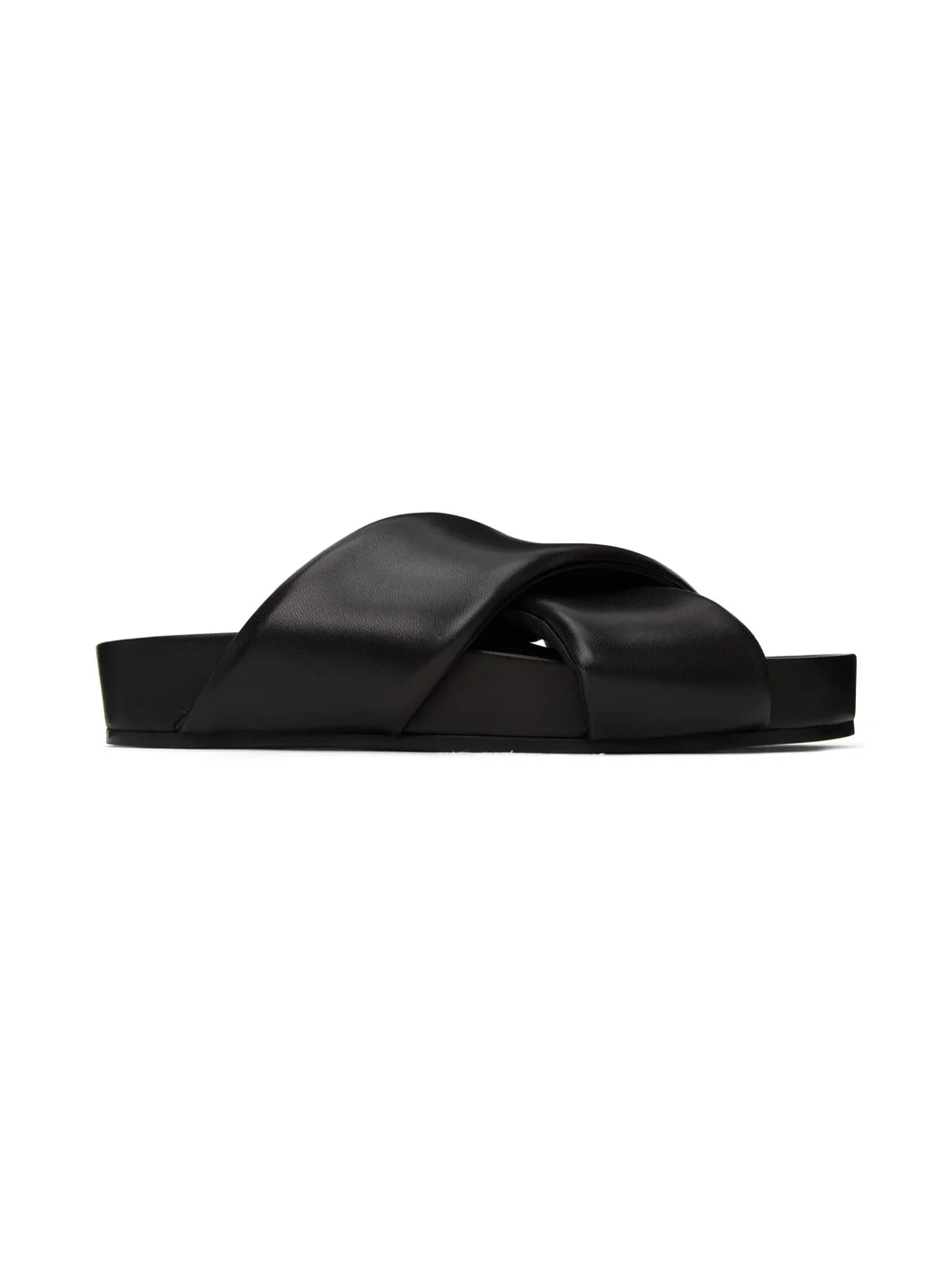 Buffed lambskin slip-on sandals in black. · Padded criss-crossing straps at vamp · Molded footbed · Calfskin sole with rubber injection Supplier color: Black