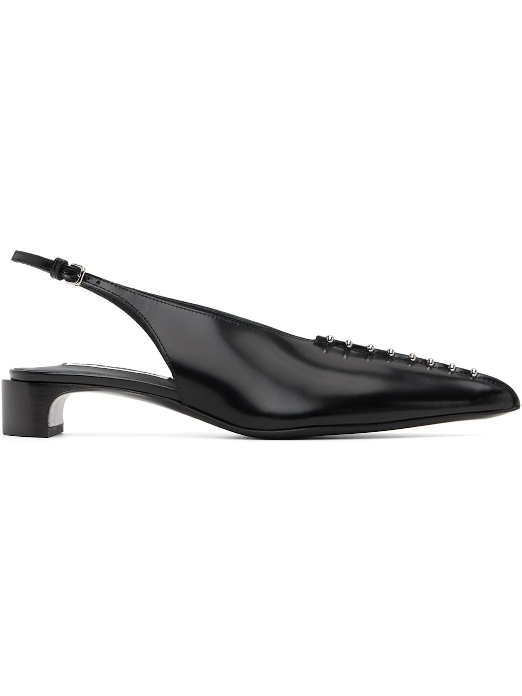 Polished leather heels. · Pointed toe · Studs and pinched seam at vamp · Pin-buckle slingback strap · Buffed leather lining · Block heel with rubber injection · Leather sole · Heel: H1.25" Supplier color: Black Upper: leather. Sole: leather, rubber. Made in Italy 252249F122012