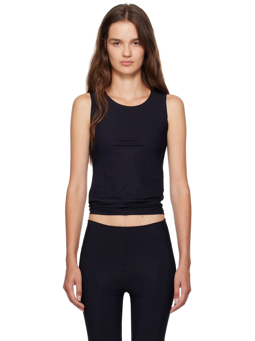 Lightweight stretch nylon jersey tank top. Seamless round neck and armscyes. Supplier color: Black 74% nylon, 26% elastane. Made in Italy 252249F111002