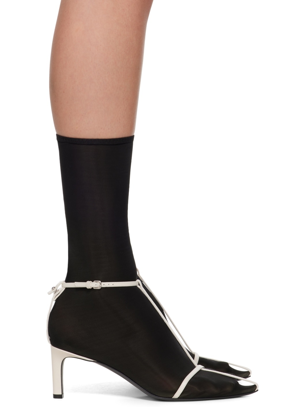Ankle-high stretch nylon jersey sock-style boots in black. · Buffed goatskin trim in white throughout · Pointed toe · Pin-buckle ankle strap · Stiletto heel · Leather sole with rubber injection · Heel: H2.75" Supplier color: Universe (black) Upper: textile, goatskin. Sole: leather, rubber. Made in Italy 241249F122008