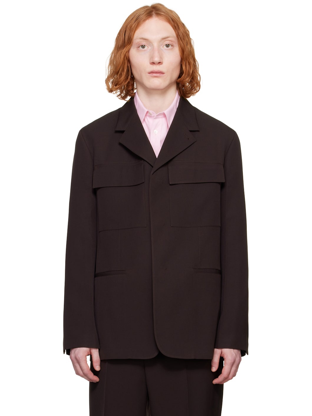 Wool gabardine blazer. · Notched lapel · Button closure · Flap pockets at chest · Welt pockets · Padded shoulders · Vented cuffs · Central vent at back hem · Welt pockets at interior · Full satin lining Supplier color: Chocolate brown Body: 100% wool. Lining 1: 100% viscose. Lining 2: 100% cotton. Made in Italy 251249M195001