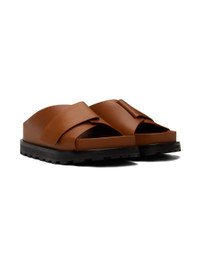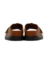Buffed leather slides in brown. · Open toe · Velcro strap at vamp · Logo patch at molded leather footbed · Grained leather lining · Foam rubber midsole · Treaded rubber sole Supplier color: Acorn Upper: leather. Sole: rubber. Made in Italy 241249F121003