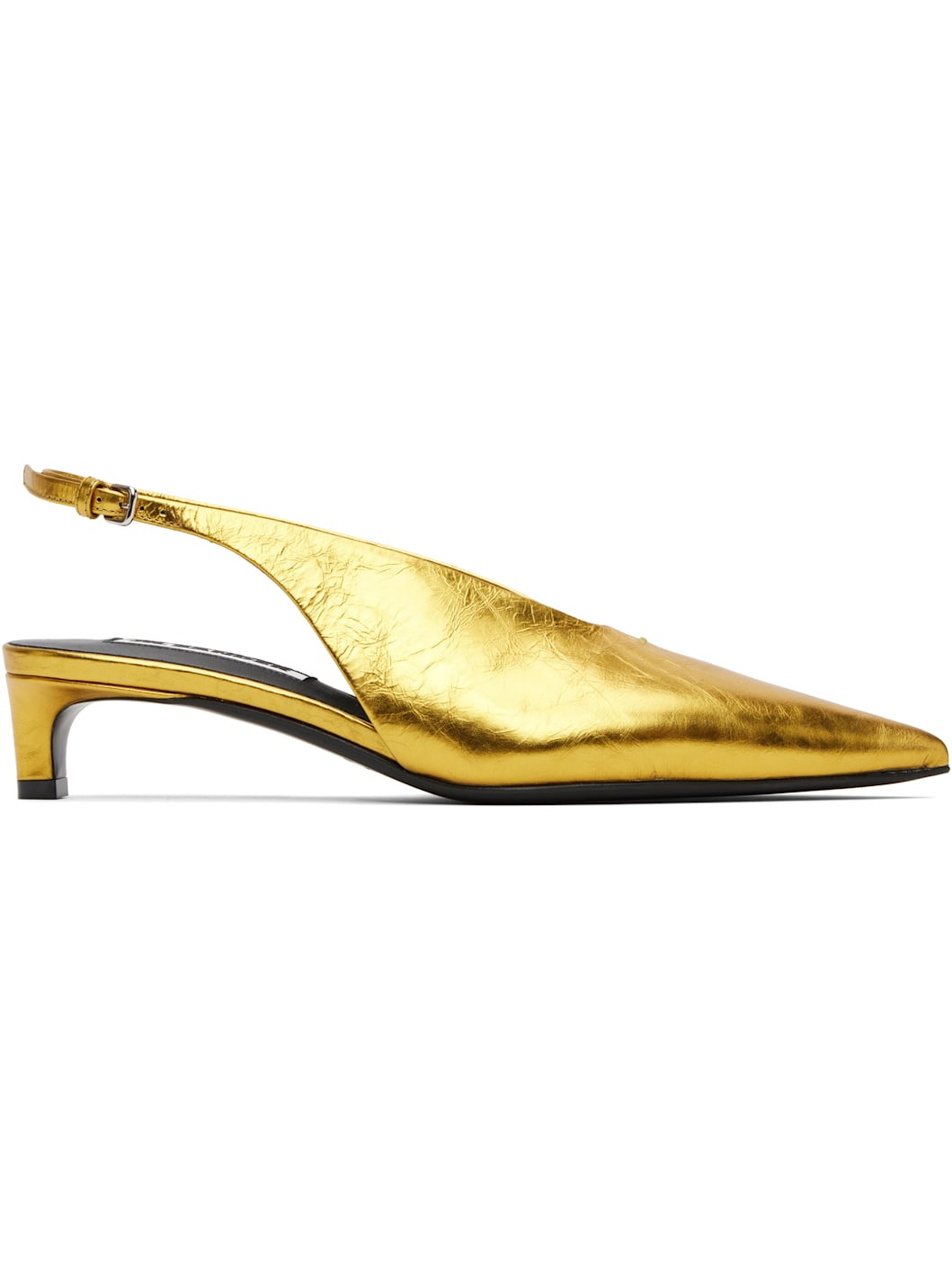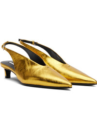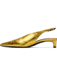 Grained calfskin heels. · Pointed toe · Stitch at vamp · Pin-buckle slingback strap · Covered kitten heel · Leather sole with rubber injections · Heel: H1.5" Supplier color: Giallo scuro Upper: calfskin. Sole: leather, rubber. Made in Italy 252249F122003