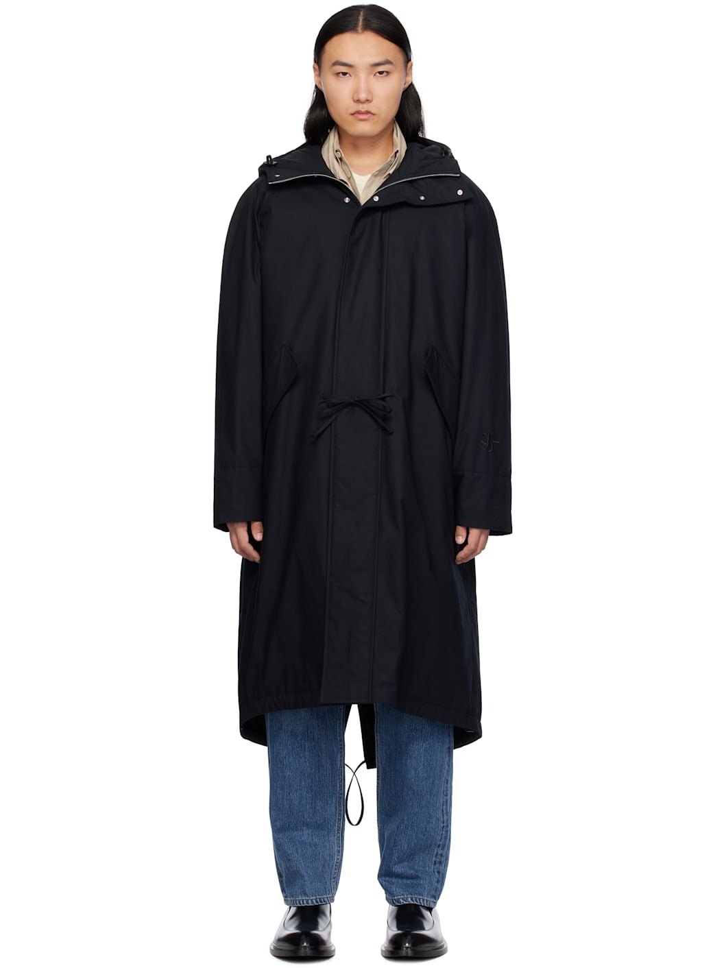 Oversized insulated organic cotton poplin coat. · Water-repellent · Cord-lock drawstring at hood · Funnel neck · Two-way zip closure with press-stud placket · Flap pockets · Drawstring at waist · Cord-lock drawstring at fishtail hem · Raglan sleeves · Press-stud fastening at cuffs · Patch pocket at interior · Fully lined · Logo-engraved silver-tone hardware Supplier color: Dark navy Body: 100% cotton. Fill: 100% polyester. Lining: 100% cotton. Made in Italy 242249M176016