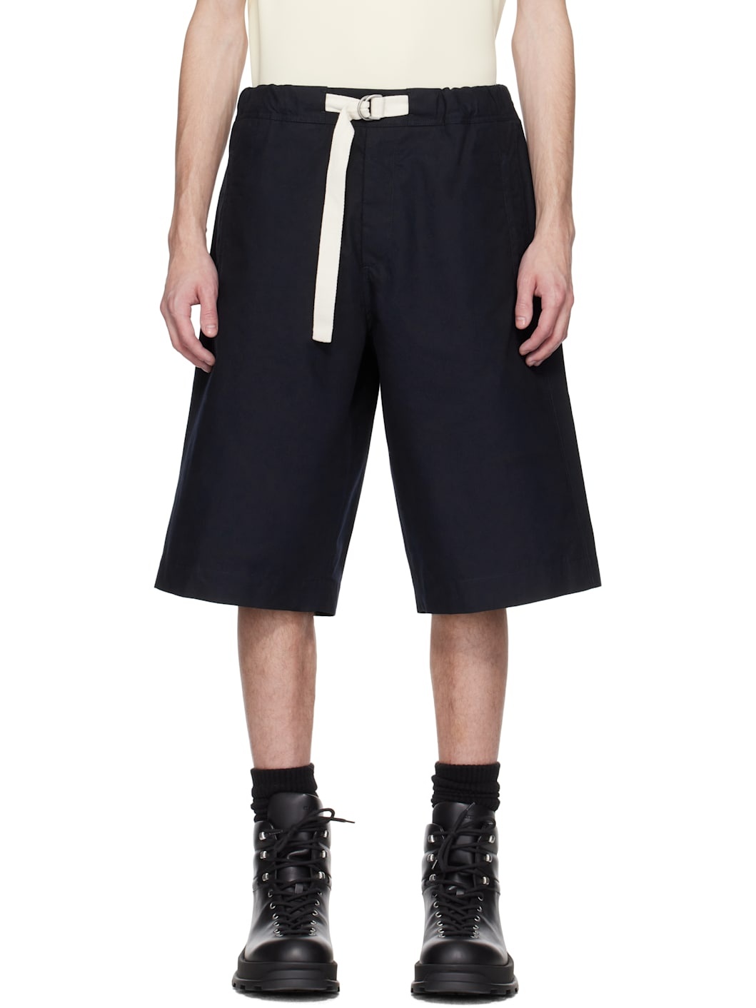 Loose-fit and wide-leg peached organic cotton twill shorts. · Water-repellent · Belt loops · Integrated cinch belt at elasticized waistband · Four-pocket styling · Zip fly · Logo embroidered at back waist Supplier color: Dark navy 100% organic cotton. Made in Italy 251249M193017