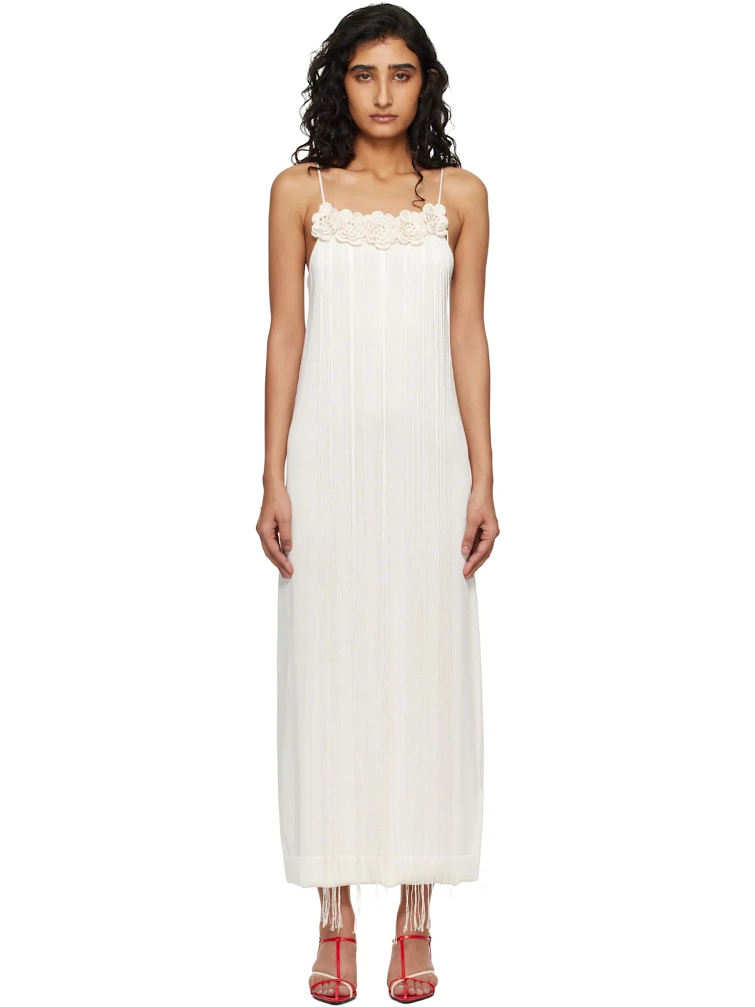 Knit stretch viscose- and cotton-blend maxi dress. · Floral appliques with fringed detailing at square neck · Fixed spaghetti straps Supplier color: Porcelain 63% viscose, 33% cotton, 3% polyamide, 1% elastane. Made in Italy 261249F055001
