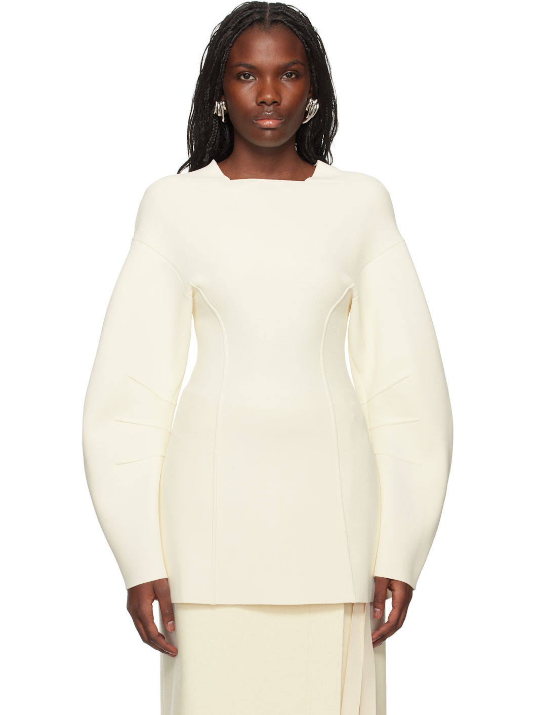Knit viscose-blend sweater. Darts and raised seams throughout · Raw edge at square neck, hem, and cuffs · Dropped shoulders · Curved seam at sleeves Supplier color: Cloud 83% viscose, 17% polyester. Made in Italy 242249F096023
