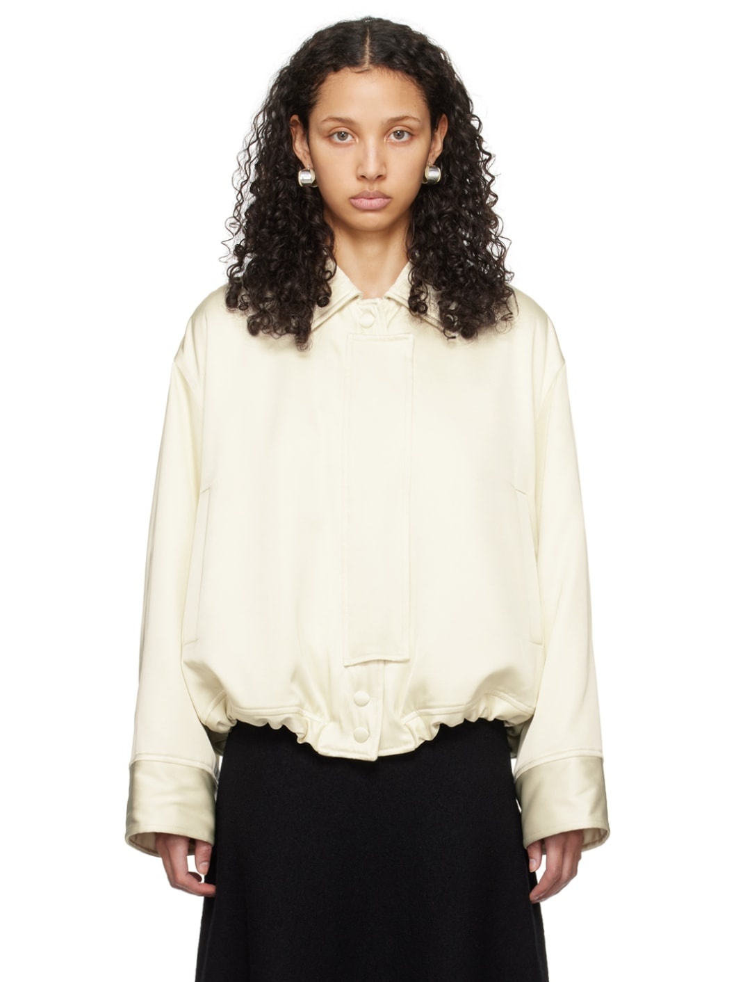 Padded heavyweight viscose- and silk-blend twill bomber jacket. · Spread collar · Two-way zip closure with press-stud placket · Welt pockets · Concealed bungee-style drawstring at cropped hem · Adjustable press-stud barrel cuffs · Tuck at back yoke extends to sleeves · Welt pocket at interior · Full twill lining Supplier color: Natural Body: 83% viscose, 17% silk. Fill: 100% polyester. Lining: 100% viscose. Made in Italy 241249F058000