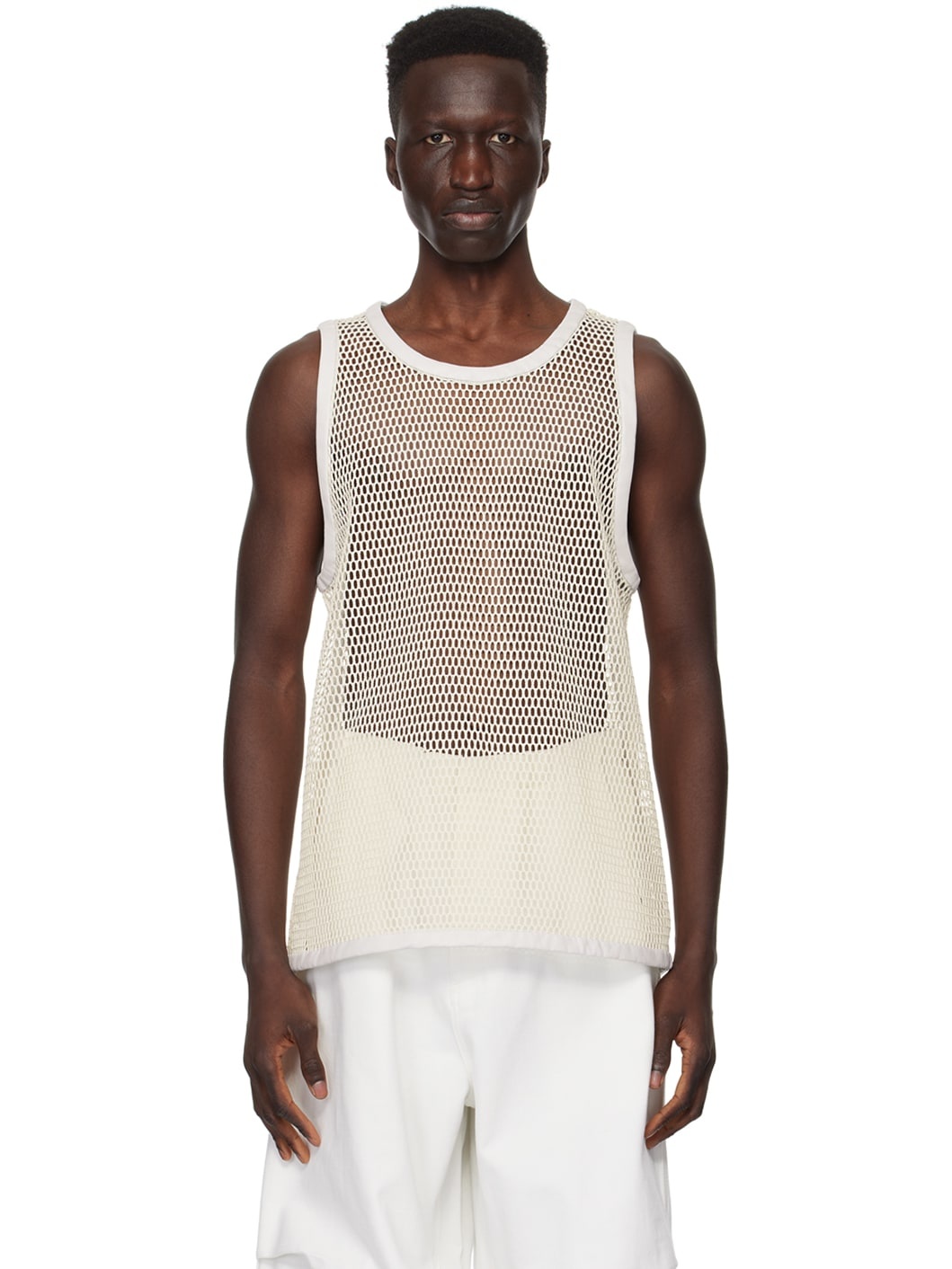 Open-crocheted polyester tank top. · Grained sheepskin trim throughout · Scoop neck Supplier color: Chalk Body: 100% polyester. Trim: 100% sheepskin. Made in Italy 241249M214000