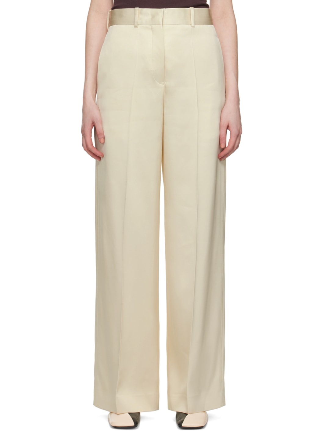 Wide-leg viscose-blend twill trousers. · High rise · Belt loops · Four-pocket styling · Zip-fly · Central creases at front and back · Partial twill lining Supplier color: Natural Body: 83% viscose, 17% silk. Lining: 100% cotton. Made in Italy 241249F087016