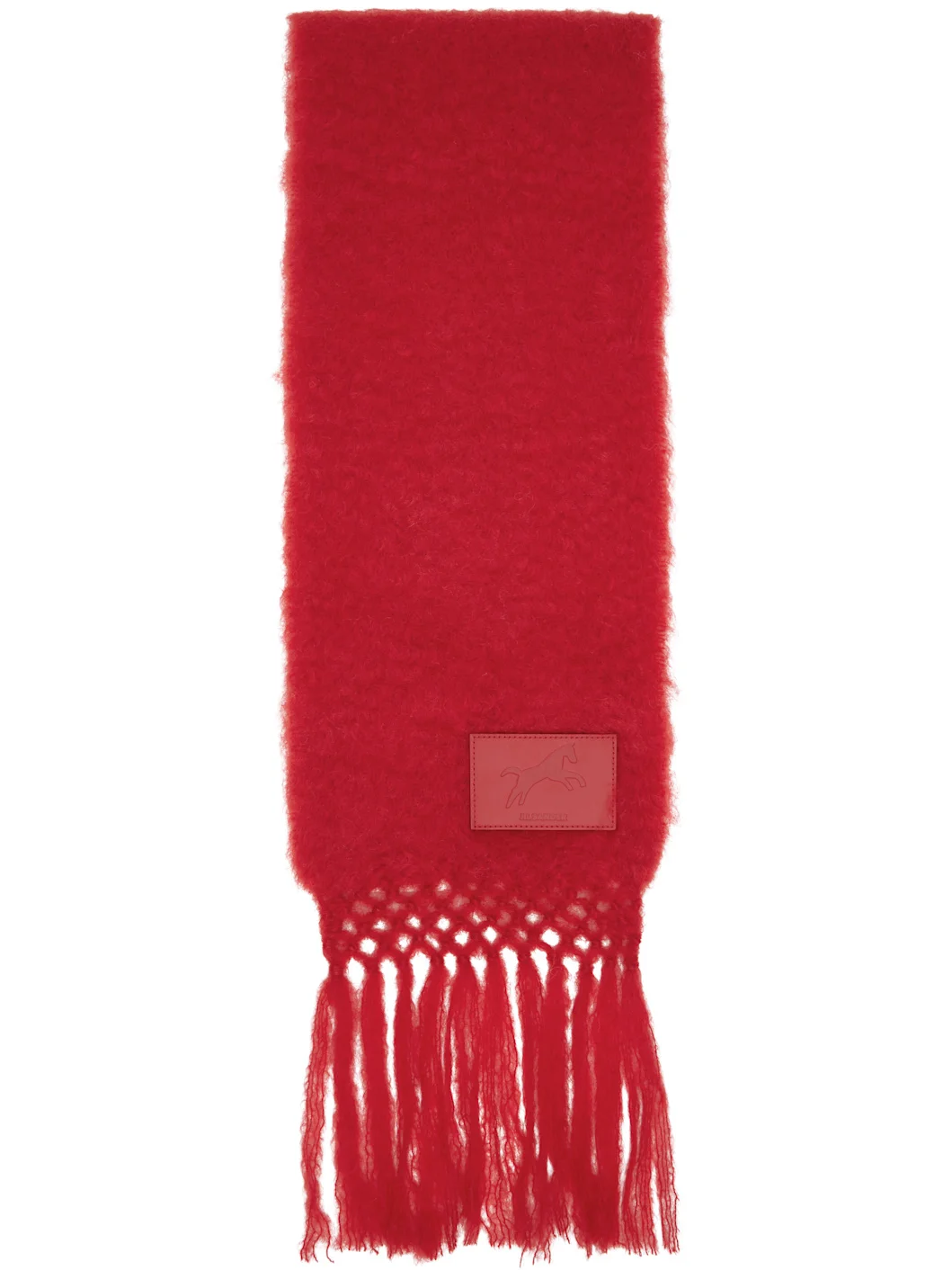 Rectangular brushed hand-knit mohair-blend scarf. · Logo patch at face · Braided and fringed detailing at ends · L74" x W11" Supplier color: Red 73% mohair, 24% wool, 3% polyamide. Made in Spain 261249F028000