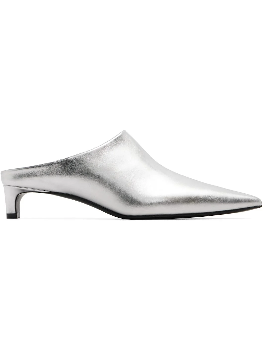 Laminated leather slip-on heels. · Pointed toe · Buffed leather lining · Kitten heel with rubber injection · Leather sole · Heel: H1.5" Supplier color: Sky grey Upper: leather. Sole: leather, rubber. Made in Italy 252249F122008