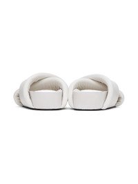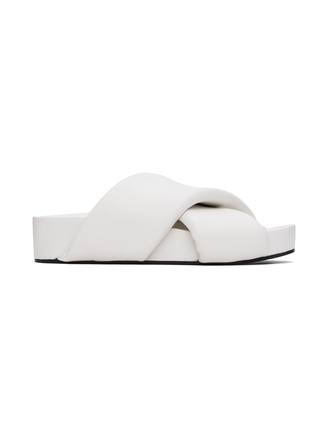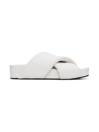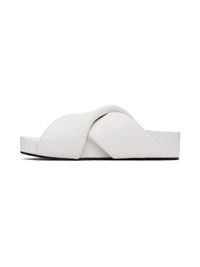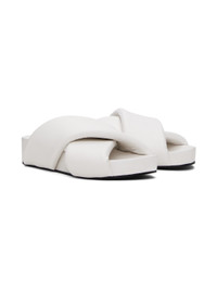 Padded buffed nappa lambskin slip-on sandals in white. · Criss-crossing straps at vamp · Logo patch at moulded leather footbed · Covered platform midsole · Leather outsole with rubber injection · Platform: H1.5" Supplier color: Porcelain Upper: lambskin. Sole: leather. Made in Italy 241249F124001