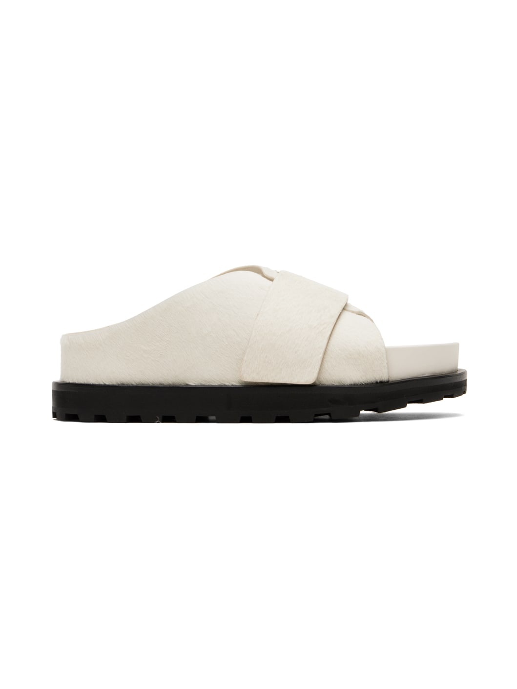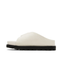 Calf-hair slides in white. · Open toe · Velcro strap at vamp · Logo patch at molded leather footbed · Grained leather lining · Foam rubber midsole · Treaded rubber sole Supplier color: Porcelain Upper: calfskin. Sole: rubber. Made in Italy 241249F121005