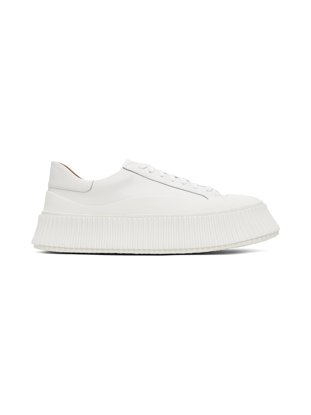 Low-top paneled buffed calfskin sneakers in white. · Rubberized trim throughout · Lace-up closure · Padded tongue and collar · Grained calfskin and suede lining · Textured rubber platform midsole · Vulcanized rubber outsole · Platform: H1.75" Supplier color: Neve Upper: calfskin. Sole: rubber. Made in Spain 241249F128003