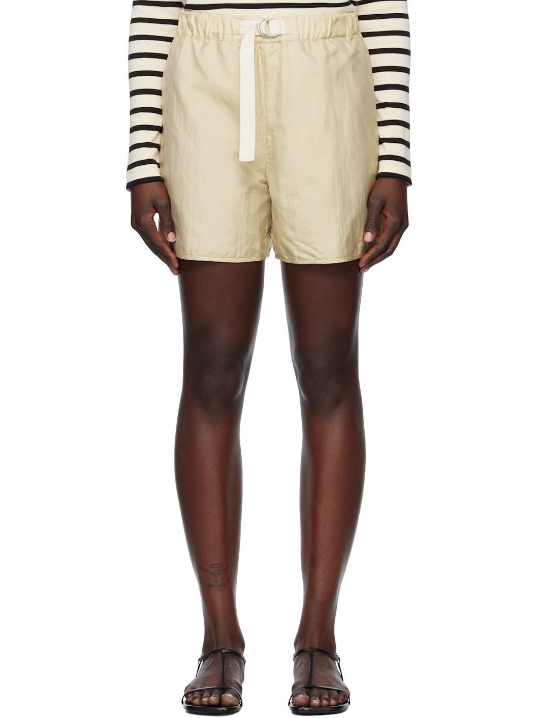 Crinkled nylon- and silk-blend taffeta shorts. · Integrated cinch belt at elasticized waistband · Three-pocket styling · Logo flag at cuff Supplier color: Almond 64% polyamide, 36% silk. Made in Italy 251249F088008