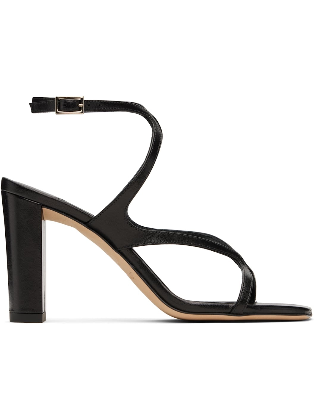 Nappa leather heeled sandals in black. · Open square toe · Crisscrossing straps at vamp · Partially elasticized pin-buckle ankle strap · Covered block heel with rubber injection · Nubuck sole · Heel: H3.25" Supplier color: Black Upper: leather. Sole: leather, rubber. Made in Italy 251528F125020