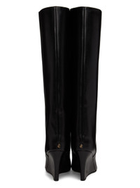 Calf-high buffed calfskin boots in black. · Pointed toe · Silver-tone logo hardware at heel · Buffed calfskin lining in beige · Covered wedge heel · Leather sole with rubber injection · Heel: 3.25 in Supplier color: Black Upper: calfskin. Sole: rubber, leather.