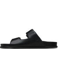 Buffed calfskin flat sandals. · Open toe · Velcro straps at vamp · Logo embossed at molded leather footbed · Treaded rubber sole · Faux-pearl and gold-tone logo hardware Supplier color: Black Upper: calfskin. Sole: rubber. Made in Italy 252528F124007