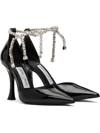 Patent leather heels in black. · Pointed toe · Crystal-cut cup chain ankle strap · Charm at strap · Logo patch at padded leather footbed · Buffed leather lining · Covered spool heel with rubber injection · Polished leather sole · Heel: H4" Supplier color: Black Upper: leather. Sole: leather, rubber. Made in Italy 251528F122069