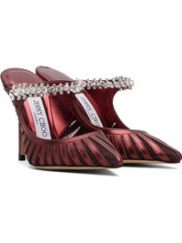 Grained nappa lambskin and mesh heels. · Pointed toe · Crystal-cut accents at fixed strap · Logo patch at grained leather footbed · Covered stiletto heel · Calfskin nubuck sole · Heel: H4" Supplier color: Deep merlot Upper: lambskin, textile. Sole: calfskin. Made in Italy 252528F122021