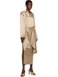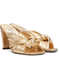 Nappa leather heeled sandals in gold tone. · Open square toe · Knotted accent at vamp · Covered block heel with rubber injection · Nubuck sole · Heel: H3.25" Supplier color: Gold Upper: leather. Sole: leather, rubber. Made in Italy 251528F125028