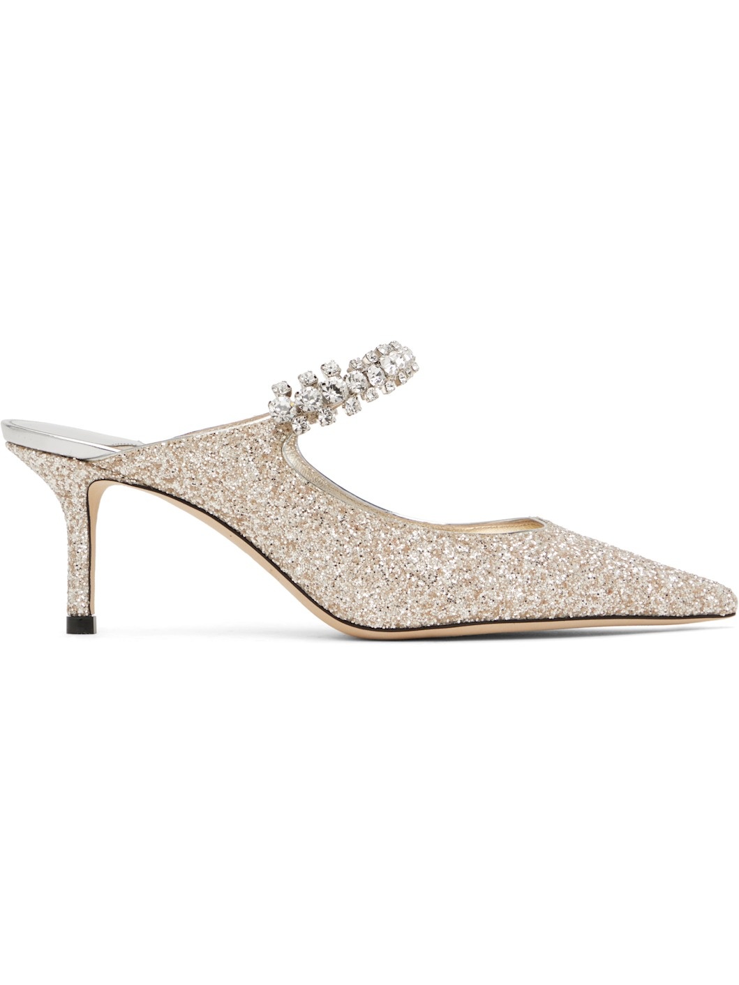 Glittered mules in gold tone. · Pointed toe · Strap with hand-finished crystal-cut detailing at vamp · Logo patch at padded leather footbed · Buffed leather lining · Covered kitten heel with rubber injection · Nubuck sole · Heel: H2.5" Supplier color: Sand Upper: textile. Sole: leather, rubber. Made in Italy 251528F122016