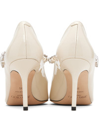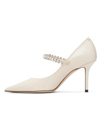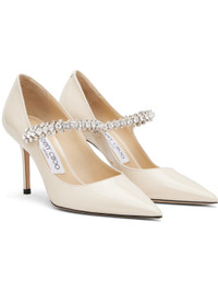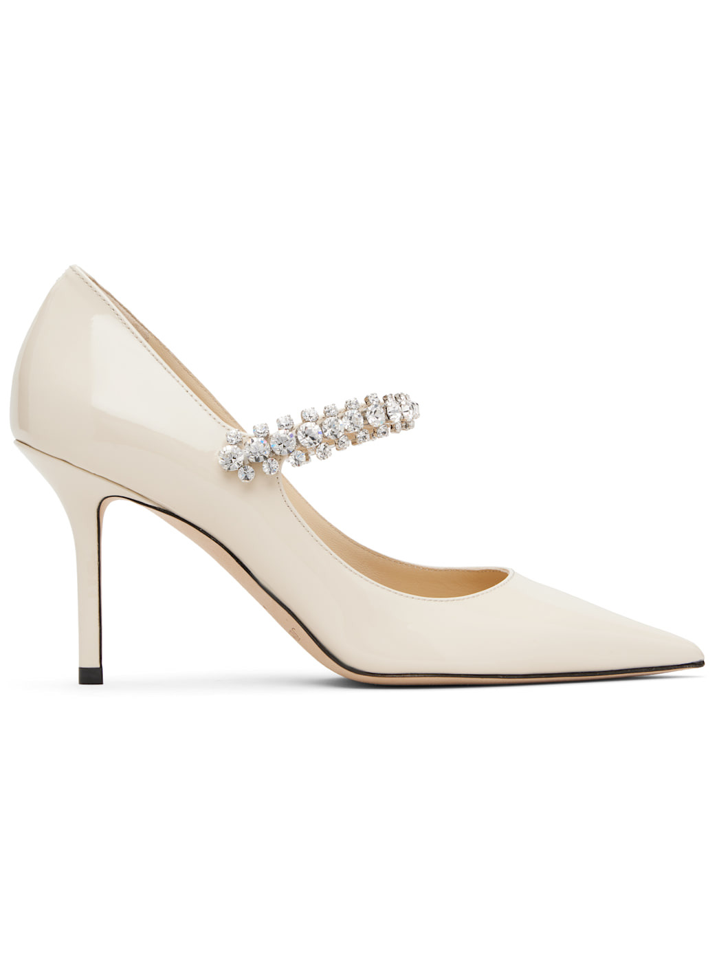 Patent leather heels. · Pointed toe · Crystal-cut accents at fixed strap · Covered stiletto heel · Nubuck sole · Heel: H3.25" Supplier color: Linen Leather. Made in Italy 251528F122035