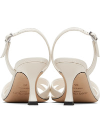 Buffed nappa lambskin heeled sandals. · Open toe · Crisscrossing straps at vamp · Pin-buckle slingback strap · Logo patch at padded leather footbed · Covered spool heel with rubber injection · Calfskin nubuck sole · Heel: H2.75" Supplier color: Latte Upper: lambskin. Sole: calfskin. Made in Italy 252528F125012