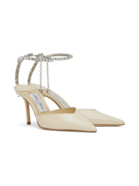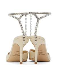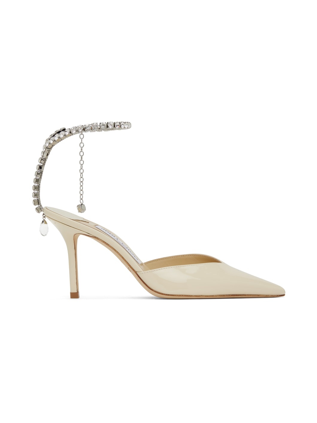 Patent leather heels in off-white. · Pointed toe · Adjustable crystal-cut ankle strap · Crystal-cut charm at side and heel · Logo patch at padded footbed · Covered stiletto heel · Suede sole · Heel: H3.25" Supplier color: Linen/Crystal Upper: leather. Sole: leather, rubber. Made in Italy 241528F122027