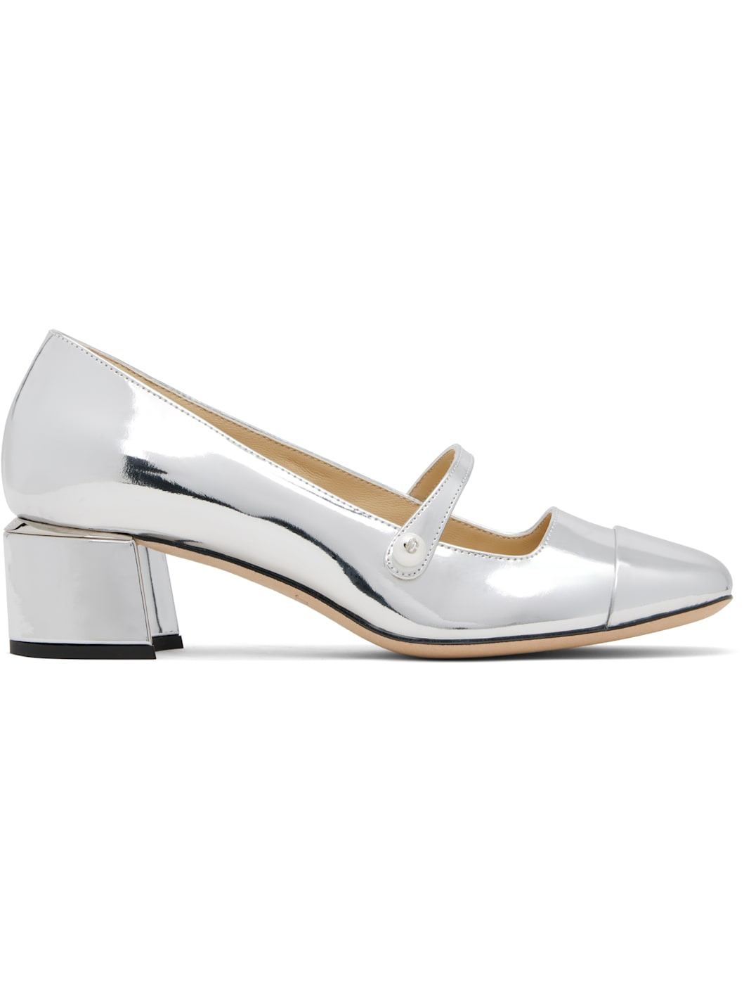 Patent leather heels. · Square cap toe · Faux-pearl and logo hardware at fixed strap · Logo plaque at heel counter · Covered block heel with rubber injection · Nubuck sole · Heel: H1.75" Supplier color: Silver Leather. Made in Italy 251528F122028