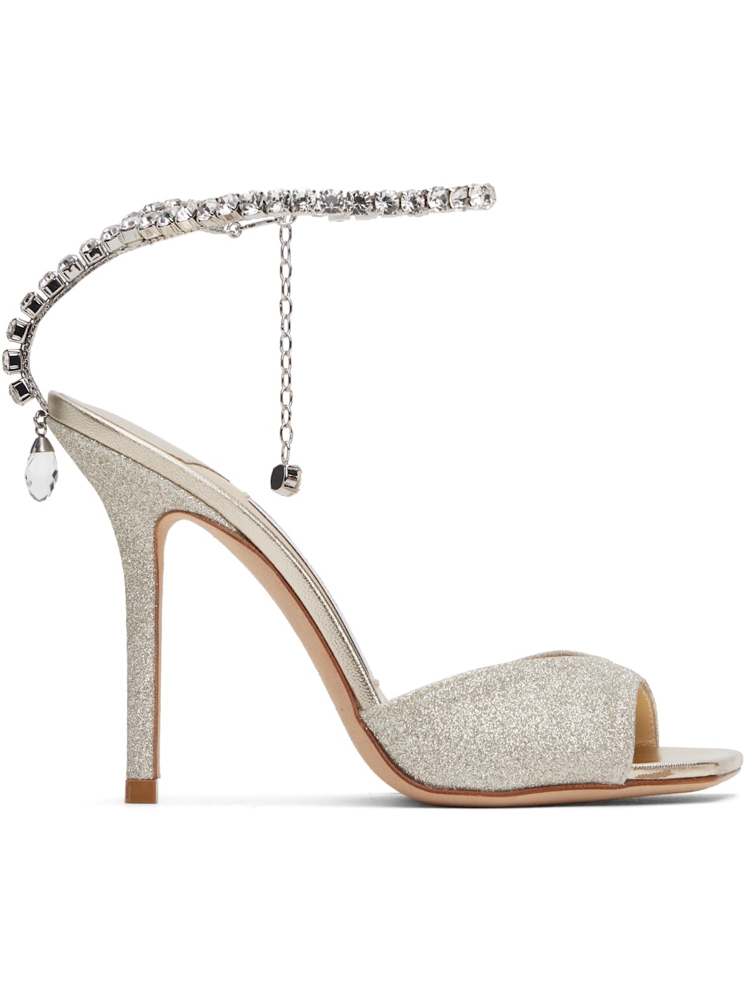 Glittered heeled sandals in silver tone. · Open square toe · Cup chain detailing at hook-eye ankle strap · Logo patch at padded footbed · Covered stiletto heel with rubber injection · Leather sole · Heel: H4" Supplier color: Platinum ice/Crystal Upper: textile. Sole: leather, rubber. Made in Italy 251528F125041