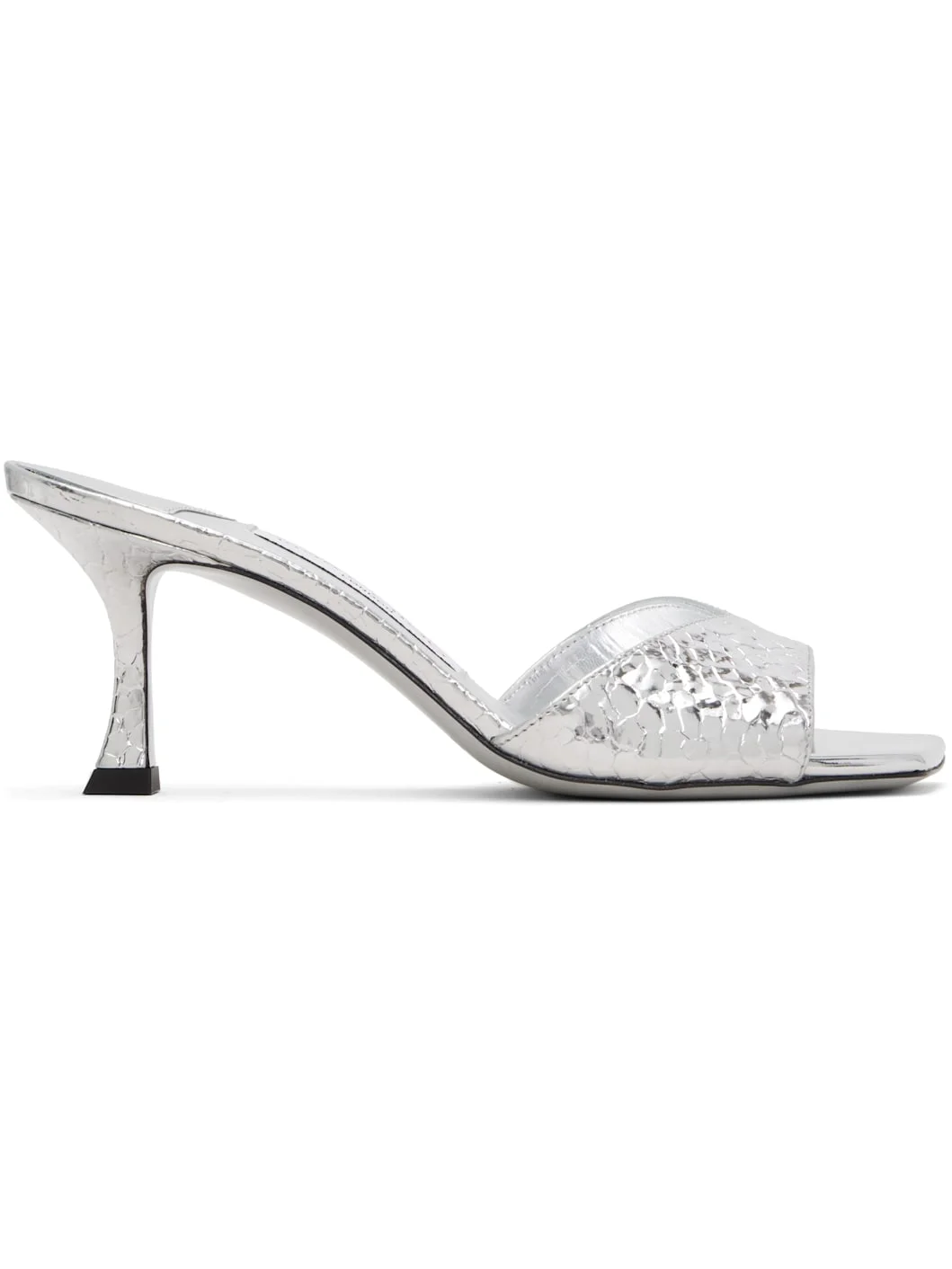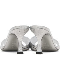 Crackled leather heeled sandals. · Open square toe · Logo patch at padded footbed · Covered stiletto heel with rubber injection · Leather sole with rubber injection · Heel: H2.75" Supplier color: Silver Upper: leather. Sole: leather, rubber. Made in Italy 261528F125026